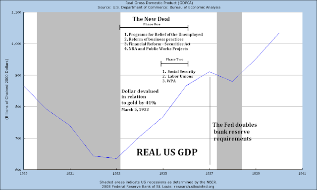 Personal Consumption along with Government Program spending and the currency devaluation were obviously factors to the real recovery in GDP especially since it did not come from net exports. As can be seen from other slides in this series the dip in GDP in 1938 was due to the Fed's draining reserves by increasing bank reserve requirements out of a misplaced fear of inflation.