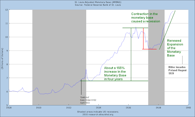 The Fed kept expanding the balance sheet into the 1938 period when they prematurely drained reserves out of a fear of inflation and triggered another recession. That was a clear policy error and can be seen as clear as a bell on this chart below.