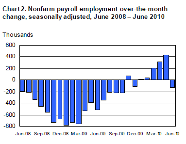 Total nonfarm payroll employment declined by 125,000 in June, and the unemployment rate edged down to 9.5 percent, the U.S. Bureau of Labor Statistics reported today. The decline in payroll employment reflected a decrease (-225,000) in the number of temporary employees working on Census 2010. Private-sector payroll employment edged up by 83,000.