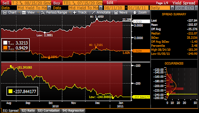 At some point in the near future Ben is going to defend QE. I think he will say that his policies are responsible for 90% of the stock market advance and less than 10% of the commodities. In other words; he will talk his book. There is one area that provides a clear-cut measure of what the Fed is doing. I doubt even Ben would argue that he is not 95% responsible for this success/failure. Inflation expectations have widened substantially since QE2 was first brought up by the Chairman in Jackson Hole. Consider these charts of 10-year coupons Vs Tips: