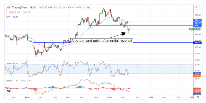 Acuity Brands is at the bottom but it may not be ready to rebound just yet. The price action hit a new low the week before earnings were released and a bounce is in play but the market looks indecisive. In this light, price action may retest the recent low or even move lower due to general market conditions and not the business fundamentals. In this scenario, the stock will become more attractive but there is an equal risk in waiting. If the market is able to hold the current levels, the stock could easily bounce back to the $170 level or higher.