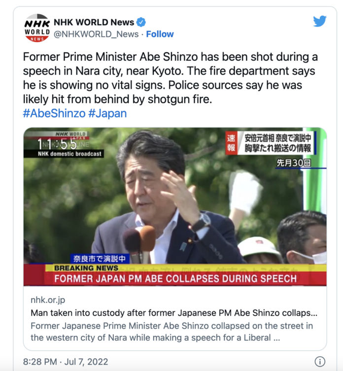 Former Prime Minister Abe Shinzo has been shot during a speech in Nara city, near Kyoto. The fire department says he is showing no vital signs. Police sources say he was likely hit from behind by shotgun fire.#AbeShinzo #Japan https://t.co/nOJC0dkIjG