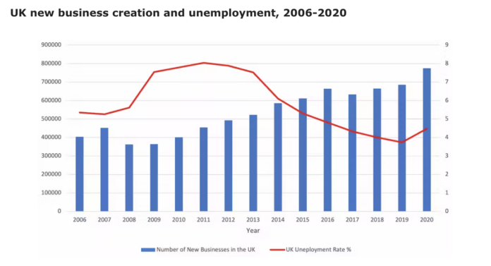 There is certainly good evidence for the existence of this contradictory relationship. The graph below shows the rates of UK business creation in blue and unemployment in red. As you can see, unemployment started to increase during the global financial crisis of 2007-09 and business creation followed not long after.