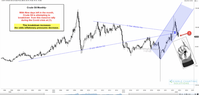 Today’s chart offers some hope to consumers. Below is a “monthly” chart of crude oil. As you can see, crude looks to be breaking below potential triple support at (1). Should crude oil close the month below support, it would be very bearish.