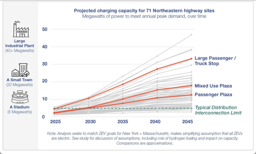 A new report from the electricity and gas utility National Grid (which serves parts of New York and Massachusetts) found a rapid increase in electric vehicles on the city streets and highways will require upgraded power grids to handle all the new demand. By 2035, a charging station could demand as much power as a sports arena or small town.
