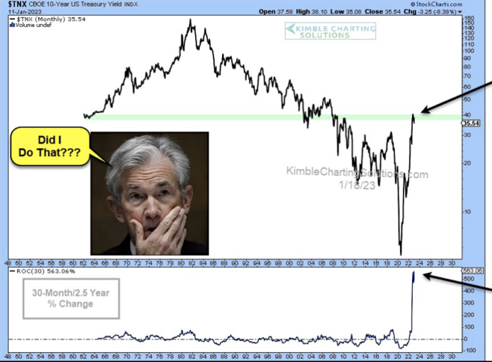 As you can see, the 10-year bond yield rallied up to the 23% Fibonacci retracement level of the 1980s high/2020s low (green line). And, while doing so, it recorded a Rate-Of-Change (ROC) that we haven’t seen before: yields are up 560% in 30 months! That is up 400% more than any 30-month period in the past 60 years. Looks like it’s time for a breather…