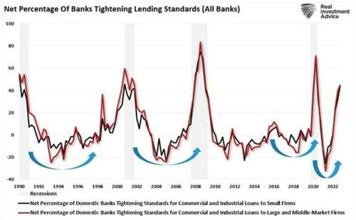 As shown, lending conditions have tightened markedly, and such tightening always precedes recessionary slowdowns.