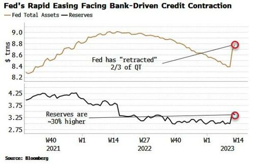 The Fed over the last two weeks has effectively reversed two-thirds of QT, if we look at the size of its balance sheet. But the key metric to watch is reserves – these are the higher-velocity part of the central bank’s liabilities, as they are the other side of the coin of bank deposits. Yet even reserves are 30% higher.