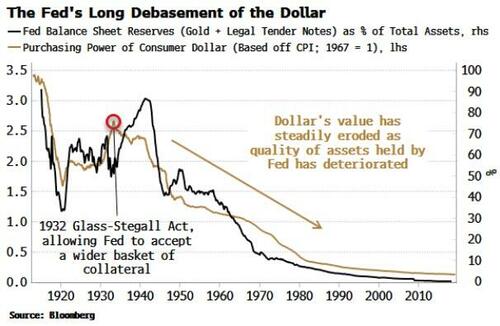 There is almost a 1-1 relationship between the degradation in the Fed’s balance sheet – as captured by the percentage of high-quality assets – and the real value of the dollar, i.e. its purchasing power.