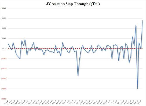 Starting at the top, the auction priced at a high yield of 3.695%, a sharp drop from last month’s 3.810%, but more importantly, it stopped through the When Issued 3.723% by 2.8bps, which was the biggest stop through on record (with data going back to 2016).