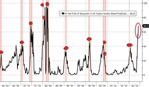 The probability that the country will enter a recession within the next year has risen to 68.2 percent, according to the New York Fed, which is the highest level since 1982.