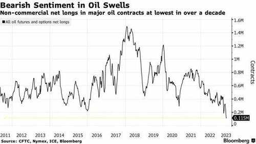 The gloom over the oil market this year – a sharp contrast to last year’s Ukraine war-driven meltup – has come from multiple directions, including expectations that the Fed’s rate hikes will provoke a contraction (oddly enough, this has not impacted stocks or bonds) and China’s disappointing rebound from its Covid-19 restrictions. Add in the threat of a US default if politicians fail to raise the debt ceiling and the possibility that OPEC+ may not deliver all the output cuts they’ve pledged, and traders have no shortage of bear scenarios to choose from.