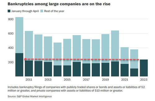 The increase is most visible among large companies, where there were 236 bankruptcy filings in the first four months of this year, more than double 2022 levels, and the fastest YTD pace since 2010 according to S&P Global Market Intelligence.