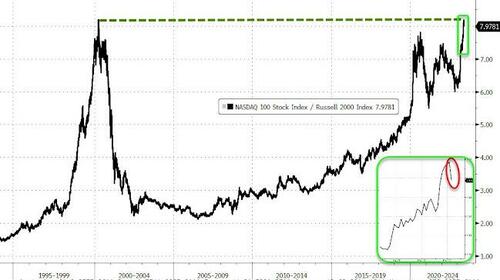 On a day when the euphoric AI mania is taking a break (which hasn’t stopped the Nasdaq from hitting fresh 52 week highs), market flows have reversed modestly out of tech and into small caps, which are surging and reversing just a little of that record QQQ/RTY skew …