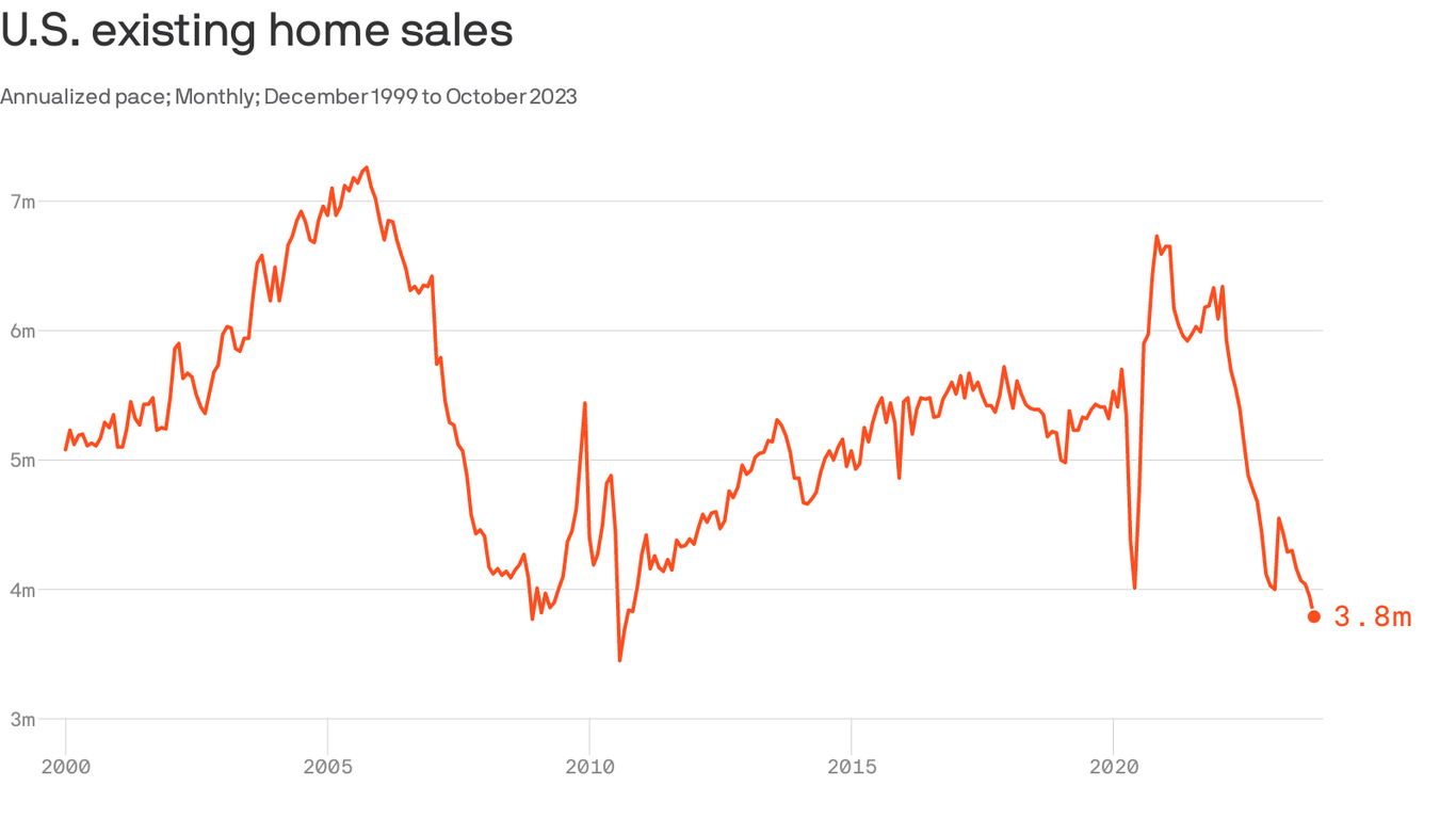 HomeMarkets Markets U.S. home sales fall to lowest since 2010 By news November 22, 2023 0 351 FacebookTwitterPinterestWhatsApp Home sales are at their lowest since the Great Recession housing bust. Why it matters: Housing is a huge part of the economy — it’s about 17% of GDP …This post was originally published on this site Share FacebookTwitterPinterestWhatsApp Subscribe Login Notify of new follow-up comments new replies to my comments Please login to comment 0 Comments Inline Feedbacks View all comments Stay Connected149,201FansLike396,312FollowersFollow2,680SubscribersSubscribe Latest Articles Markets Thursday Thoughts – The Circle Jerk Economy is Back in Full Swing Market News On the Brink of Global Recession Energy Iran Again Tightens Its Grip on Shipping in the Strait of Hormuz Biotech HHS rejects publication of study showing Covid-19 vaccines prevent hospitalizations, ER visits Markets (Plunder) America First: The Grand Strategy of Donald Trump Markets Is Trump heading to a Pyrrhic victory in Iran? Markets Which Way Wednesday – The Physics of Oil Won’t Negotiate Market News Why the US military is stuck using $1 million missiles against Iran’s $20,000 drones AI Unauthorized group has gained access to Anthropic’s exclusive cyber tool Mythos, report claims AI Apple’s John Ternus will run one of the world’s most powerful companies; the job is a minefield Energy Trump announces extension of Iran ceasefire until ‘discussion concluded’ Top Trades PhilStockWorld Top Trade Alert – April 21st, 2026 – Synchrony Financial (SYF) Markets Peace Talks Tuesday – Markets Rally Over Negotiations That May Not Even Be Happening Market News Trump Administration Takes Steps to Refund $166 Billion in Tariffs Load more