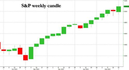 … US equity futures indicated a pause for stocks which trade at their all-time highs as investors geared up for a busy week of data, including the Fed’s preferred measure of inflation, the core PCE. As of 8:00am, futures on the S&P 500 and the Nasdaq 100 were fractionally in the red after Wall Street’s record-breaking rally stalled at the end of last week, weighed down by profit taking in megacap tech stocks. Treasuries climb, pushing 10-year yields down by 1bps to 4.24% while the dollar ticked lower.