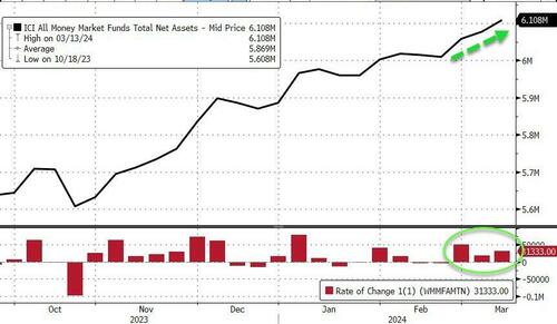 Despite soaring stocks, money-market fund assets soared to yet another fresh record high for the third straight week, adding $31BN to $6.11TN (over $100BN in three weeks)…