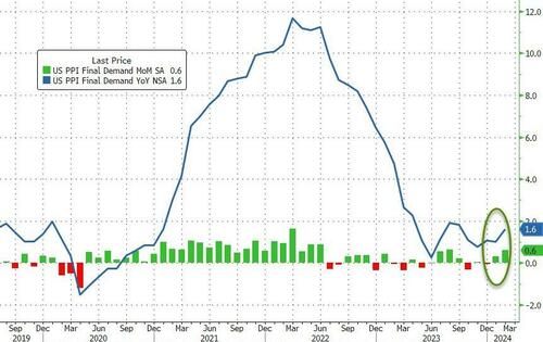 After the hotter-than-expected consumer price data, February Producer Prices were expected to slow their surge from January but they did not… with headline Final Demand PPI rising 0.6% MoM (double the 0.3% rise expected) – the hottest print since June 2022. That lifted the YoY PPI to +1.6%, its highest since September…