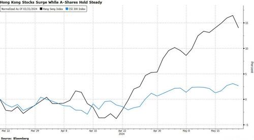 In Hong Kong, aggressive buying by foreign funds has lifted the Hang Seng Index by 18% since the close on April 19. Things, however, look much calmer onshore. The CSI 300 Index has climbed only 4% in that span, still short of a technical bull market.