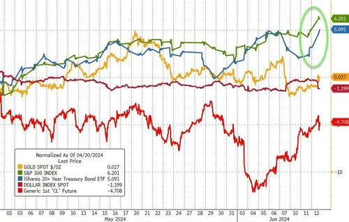 Since the last FOMC statement (on May 1st), stocks and bonds have outperformed (with the former at record highs), gold is flat while the dollar is down modestly. Amid all that, oil is down significantly…