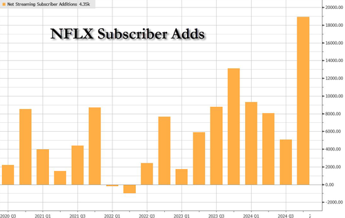 Commenting on the results, UBS writes that Netflix shares are up 11% post close “as the set up had been sell into the print, and buy back once quarterly/2025 guidance was given. This 19 mn net adds in Q4 was the standout number, beating the bogey at 13 mn (and even the highest number I heard at around 15 mn).”