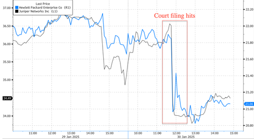 Hewlett shares in New York initially sank 6% on the court filing. Some losses have been clawed back by the late cash session. Shares of Juniper fell around 3%.