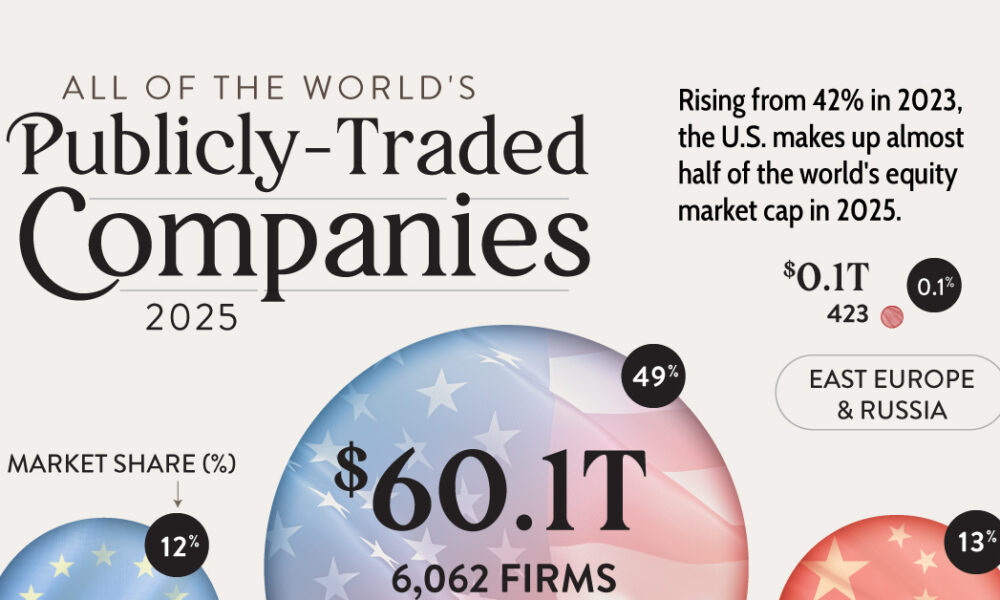 HomeMarkets Markets The $124 Trillion Global Stock Market, Sorted by Region By news February 26, 2025 0 62 FacebookTwitterPinterestWhatsApp All of the World’s Publicly-Traded Companies in 2025 America’s dominance of the global stock market is unrivaled, and its share has only grown in the …This post was originally published on this site Share FacebookTwitterPinterestWhatsApp Subscribe Login Notify of new follow-up comments new replies to my comments Please login to comment 0 Comments Inline Feedbacks View all comments Stay Connected149,188FansLike396,312FollowersFollow2,680SubscribersSubscribe Latest Articles Markets Why the world’s banks are so worried about Anthropic’s latest AI model Markets I Flagged Every Trade Markets Thursday Thoughts – The Circle Jerk Economy is Back in Full Swing Market News On the Brink of Global Recession Energy Iran Again Tightens Its Grip on Shipping in the Strait of Hormuz Biotech HHS rejects publication of study showing Covid-19 vaccines prevent hospitalizations, ER visits Markets (Plunder) America First: The Grand Strategy of Donald Trump Markets Is Trump heading to a Pyrrhic victory in Iran? Markets Which Way Wednesday – The Physics of Oil Won’t Negotiate Market News Why the US military is stuck using $1 million missiles against Iran’s $20,000 drones AI Unauthorized group has gained access to Anthropic’s exclusive cyber tool Mythos, report claims AI Apple’s John Ternus will run one of the world’s most powerful companies; the job is a minefield Energy Trump announces extension of Iran ceasefire until ‘discussion concluded’ Top Trades PhilStockWorld Top Trade Alert – April 21st, 2026 – Synchrony Financial (SYF) Load more