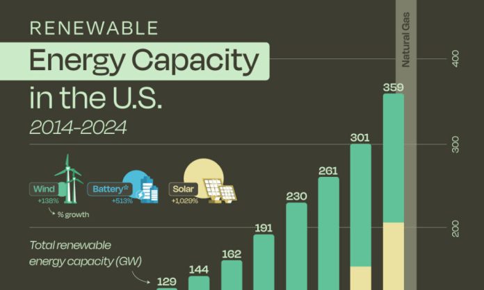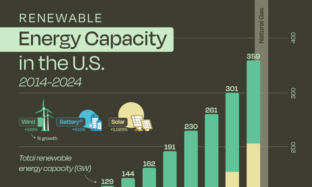 HomeMarkets Markets Charted: Renewable Energy Capacity in the U.S. (2014-2024) By news March 18, 2025 0 225 FacebookTwitterPinterestWhatsApp This graphic visualizes the past 10 years of renewable energy capacity in the U.S., based on data compiled by the World Resources Institute (WRI). In …This post was originally published on this site Share FacebookTwitterPinterestWhatsApp Subscribe Login Notify of new follow-up comments new replies to my comments Please login to comment 0 Comments Inline Feedbacks View all comments Stay Connected149,188FansLike396,312FollowersFollow2,680SubscribersSubscribe Latest Articles Markets Why the world’s banks are so worried about Anthropic’s latest AI model Markets I Flagged Every Trade Markets Thursday Thoughts – The Circle Jerk Economy is Back in Full Swing Market News On the Brink of Global Recession Energy Iran Again Tightens Its Grip on Shipping in the Strait of Hormuz Biotech HHS rejects publication of study showing Covid-19 vaccines prevent hospitalizations, ER visits Markets (Plunder) America First: The Grand Strategy of Donald Trump Markets Is Trump heading to a Pyrrhic victory in Iran? Markets Which Way Wednesday – The Physics of Oil Won’t Negotiate Market News Why the US military is stuck using $1 million missiles against Iran’s $20,000 drones AI Unauthorized group has gained access to Anthropic’s exclusive cyber tool Mythos, report claims AI Apple’s John Ternus will run one of the world’s most powerful companies; the job is a minefield Energy Trump announces extension of Iran ceasefire until ‘discussion concluded’ Top Trades PhilStockWorld Top Trade Alert – April 21st, 2026 – Synchrony Financial (SYF) Load more