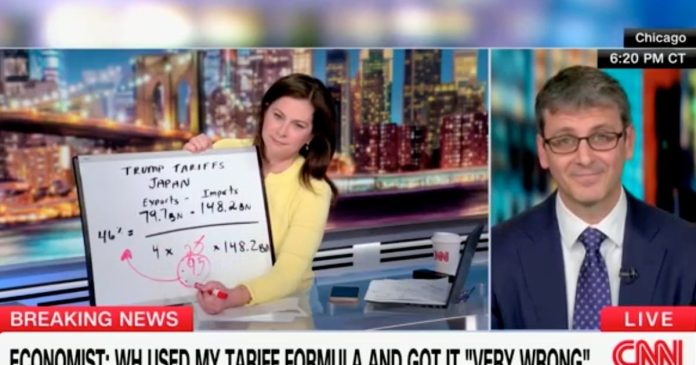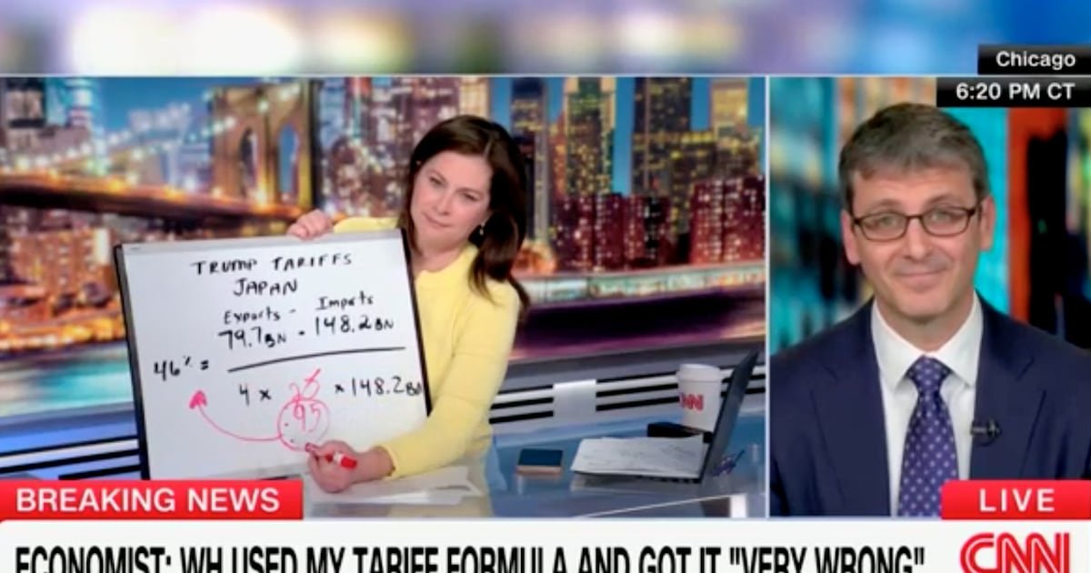 HomeMarkets Markets CNN Rolls Out Schoolroom Prop to Prove Trump’s ‘Cascade of Mistakes’ on Tariffs By news April 9, 2025 0 156 FacebookTwitterPinterestWhatsApp The exasperated economist whose tariff formula was butchered by the White House said “I don’t even know” how they got it so badly wrong.This post was originally published on this site Share FacebookTwitterPinterestWhatsApp Subscribe Login Notify of new follow-up comments new replies to my comments Please login to comment 0 Comments Inline Feedbacks View all comments Stay Connected149,188FansLike396,312FollowersFollow2,680SubscribersSubscribe Latest Articles Markets Why the world’s banks are so worried about Anthropic’s latest AI model Markets I Flagged Every Trade Markets Thursday Thoughts – The Circle Jerk Economy is Back in Full Swing Market News On the Brink of Global Recession Energy Iran Again Tightens Its Grip on Shipping in the Strait of Hormuz Biotech HHS rejects publication of study showing Covid-19 vaccines prevent hospitalizations, ER visits Markets (Plunder) America First: The Grand Strategy of Donald Trump Markets Is Trump heading to a Pyrrhic victory in Iran? Markets Which Way Wednesday – The Physics of Oil Won’t Negotiate Market News Why the US military is stuck using $1 million missiles against Iran’s $20,000 drones AI Unauthorized group has gained access to Anthropic’s exclusive cyber tool Mythos, report claims AI Apple’s John Ternus will run one of the world’s most powerful companies; the job is a minefield Energy Trump announces extension of Iran ceasefire until ‘discussion concluded’ Top Trades PhilStockWorld Top Trade Alert – April 21st, 2026 – Synchrony Financial (SYF) Load more