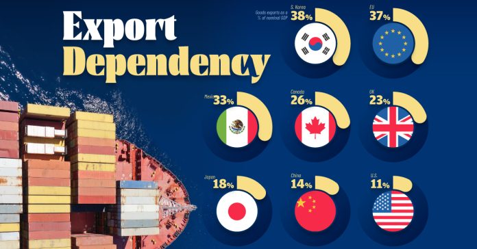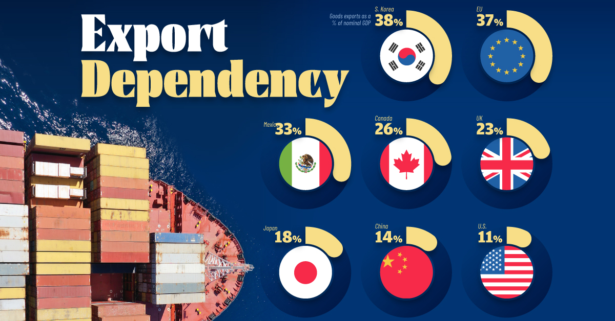 HomeMarkets Markets Ranked: The Export Dependency of Major Economies By news April 16, 2025 0 125 FacebookTwitterPinterestWhatsApp Global trade is in a precarious situation with rising tensions from President Trump’s reciprocal tariffs announced in early April, some of which were …This post was originally published on this site Share FacebookTwitterPinterestWhatsApp Subscribe Login Notify of new follow-up comments new replies to my comments Please login to comment 0 Comments Inline Feedbacks View all comments Stay Connected149,188FansLike396,312FollowersFollow2,680SubscribersSubscribe Latest Articles Markets American soldier arrested over Polymarket wagers tied to Maduro’s capture Markets Why the world’s banks are so worried about Anthropic’s latest AI model Markets I Flagged Every Trade Markets Thursday Thoughts – The Circle Jerk Economy is Back in Full Swing Market News On the Brink of Global Recession Energy Iran Again Tightens Its Grip on Shipping in the Strait of Hormuz Biotech HHS rejects publication of study showing Covid-19 vaccines prevent hospitalizations, ER visits Markets (Plunder) America First: The Grand Strategy of Donald Trump Markets Is Trump heading to a Pyrrhic victory in Iran? Markets Which Way Wednesday – The Physics of Oil Won’t Negotiate Market News Why the US military is stuck using $1 million missiles against Iran’s $20,000 drones AI Unauthorized group has gained access to Anthropic’s exclusive cyber tool Mythos, report claims AI Apple’s John Ternus will run one of the world’s most powerful companies; the job is a minefield Energy Trump announces extension of Iran ceasefire until ‘discussion concluded’ Load more