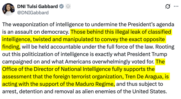 HomeMarkets Markets Intelligence Community Demolishes Trump’s Venezuelan ‘Invasion’ Claims In Record Time… Almost Like They Want Us To Know He’s Lying By news May 8, 2025 0 190 FacebookTwitterPinterestWhatsApp The Intelligence Community just demonstrated, in spectacular fashion, exactly how badly Donald Trump and his ODNI chief Tulsi Gabbard misrepresented …This post was originally published on this site Share FacebookTwitterPinterestWhatsApp Subscribe Login Notify of new follow-up comments new replies to my comments Please login to comment 0 Comments Inline Feedbacks View all comments Stay Connected149,188FansLike396,312FollowersFollow2,680SubscribersSubscribe Latest Articles Markets Why the world’s banks are so worried about Anthropic’s latest AI model Markets I Flagged Every Trade Markets Thursday Thoughts – The Circle Jerk Economy is Back in Full Swing Market News On the Brink of Global Recession Energy Iran Again Tightens Its Grip on Shipping in the Strait of Hormuz Biotech HHS rejects publication of study showing Covid-19 vaccines prevent hospitalizations, ER visits Markets (Plunder) America First: The Grand Strategy of Donald Trump Markets Is Trump heading to a Pyrrhic victory in Iran? Markets Which Way Wednesday – The Physics of Oil Won’t Negotiate Market News Why the US military is stuck using $1 million missiles against Iran’s $20,000 drones AI Unauthorized group has gained access to Anthropic’s exclusive cyber tool Mythos, report claims AI Apple’s John Ternus will run one of the world’s most powerful companies; the job is a minefield Energy Trump announces extension of Iran ceasefire until ‘discussion concluded’ Top Trades PhilStockWorld Top Trade Alert – April 21st, 2026 – Synchrony Financial (SYF) Load more