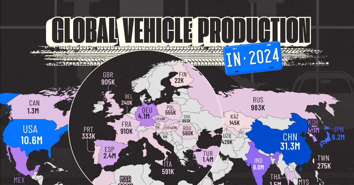 HomeMarkets Markets Mapped: Global Vehicle Production by Country By news August 14, 2025 0 423 FacebookTwitterPinterestWhatsApp The world produced over 92 million vehicles in 2024, with China, the U.S., and Japan leading the totals. While these three countries accounted for 54% …This post was originally published on this site Share FacebookTwitterPinterestWhatsApp Subscribe Login Notify of new follow-up comments new replies to my comments Please login to comment 0 Comments Inline Feedbacks View all comments Stay Connected149,188FansLike396,312FollowersFollow2,680SubscribersSubscribe Latest Articles Markets American soldier arrested over Polymarket wagers tied to Maduro’s capture Markets Why the world’s banks are so worried about Anthropic’s latest AI model Markets I Flagged Every Trade Markets ‘Should’ve Never Sold Her Soul!’ Markets Thursday Thoughts – The Circle Jerk Economy is Back in Full Swing Market News On the Brink of Global Recession Energy Iran Again Tightens Its Grip on Shipping in the Strait of Hormuz Biotech HHS rejects publication of study showing Covid-19 vaccines prevent hospitalizations, ER visits Markets (Plunder) America First: The Grand Strategy of Donald Trump Markets Is Trump heading to a Pyrrhic victory in Iran? Markets Which Way Wednesday – The Physics of Oil Won’t Negotiate Market News Why the US military is stuck using $1 million missiles against Iran’s $20,000 drones AI Unauthorized group has gained access to Anthropic’s exclusive cyber tool Mythos, report claims AI Apple’s John Ternus will run one of the world’s most powerful companies; the job is a minefield Load more