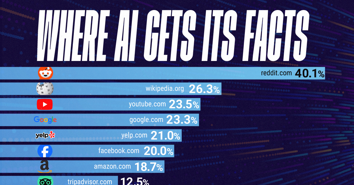 HomeMarkets Markets Ranked: The Most Cited Websites by AI Models By news August 19, 2025 0 53 FacebookTwitterPinterestWhatsApp Where do large-language models (LLMs) like ChatGPT go to source factual information? In this infographic, we rank the most cited websites by AI, based …This post was originally published on this site Share FacebookTwitterPinterestWhatsApp Subscribe Login Notify of new follow-up comments new replies to my comments Please login to comment 0 Comments Inline Feedbacks View all comments Stay Connected149,188FansLike396,312FollowersFollow2,680SubscribersSubscribe Latest Articles Markets Why the world’s banks are so worried about Anthropic’s latest AI model Markets I Flagged Every Trade Markets Thursday Thoughts – The Circle Jerk Economy is Back in Full Swing Market News On the Brink of Global Recession Energy Iran Again Tightens Its Grip on Shipping in the Strait of Hormuz Biotech HHS rejects publication of study showing Covid-19 vaccines prevent hospitalizations, ER visits Markets (Plunder) America First: The Grand Strategy of Donald Trump Markets Is Trump heading to a Pyrrhic victory in Iran? Markets Which Way Wednesday – The Physics of Oil Won’t Negotiate Market News Why the US military is stuck using $1 million missiles against Iran’s $20,000 drones AI Unauthorized group has gained access to Anthropic’s exclusive cyber tool Mythos, report claims AI Apple’s John Ternus will run one of the world’s most powerful companies; the job is a minefield Energy Trump announces extension of Iran ceasefire until ‘discussion concluded’ Top Trades PhilStockWorld Top Trade Alert – April 21st, 2026 – Synchrony Financial (SYF) Load more