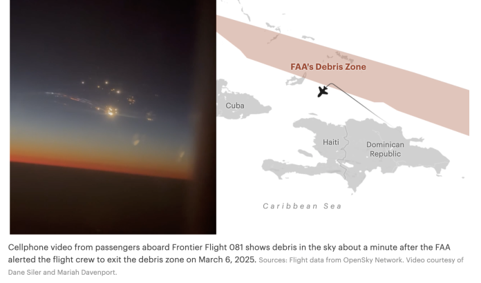 It’s unclear how accurate the FAA’s debris projections were for the March explosion. The agency acknowledged that debris fell in the Bahamas, but it did not provide ProPublica the exact location, making it impossible to determine whether the wreckage landed where the FAA expected. While some of the country’s islands were within the boundaries of the designated debris zone, most were not. Calls and emails to Bahamas officials were not returned.