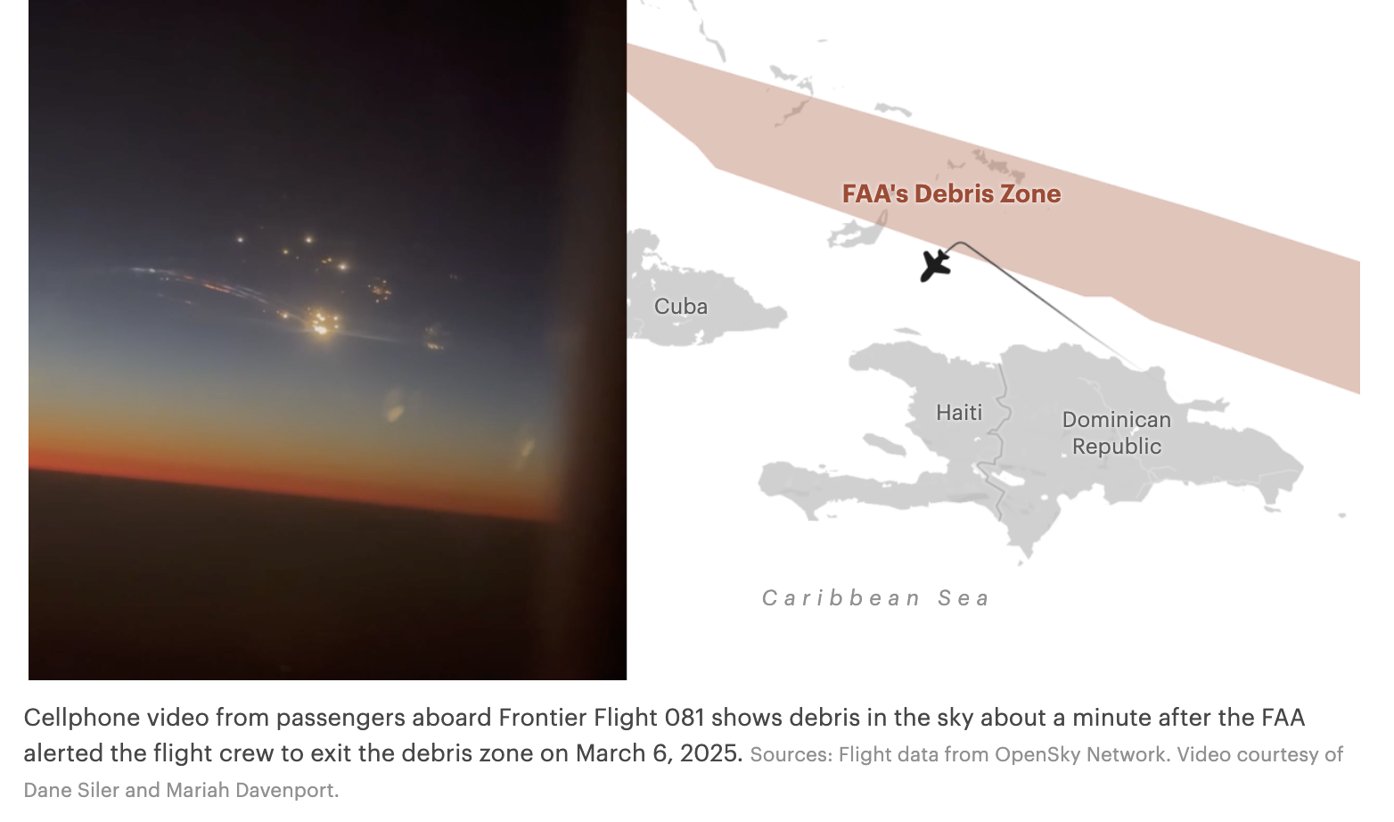 But in response to ProPublica’s questions, the Space Force acknowledged that it did not track the debris in real time. Instead, it said “computational modeling,” along with other scientific measures, allowed the agency to “predict and mitigate risks effectively.” The FAA said “the aircraft were not at risk” during the aftermath of Flight 8.