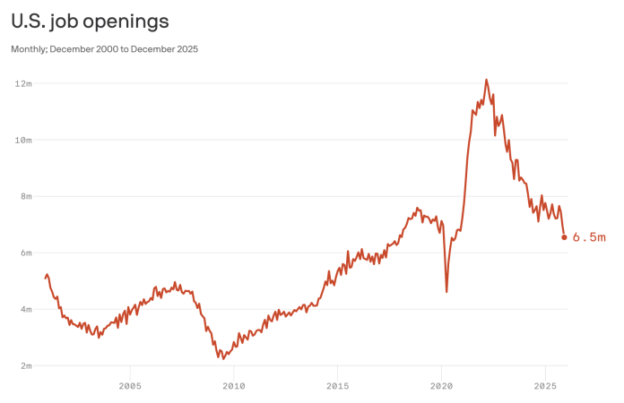 Driving the news: The shutdown-delayed Job Openings and Labor Turnover Survey (JOLTS) tells the story: After months of being “little changed,” job openings plunged in December, suggesting a drop-off in demand for new workers.