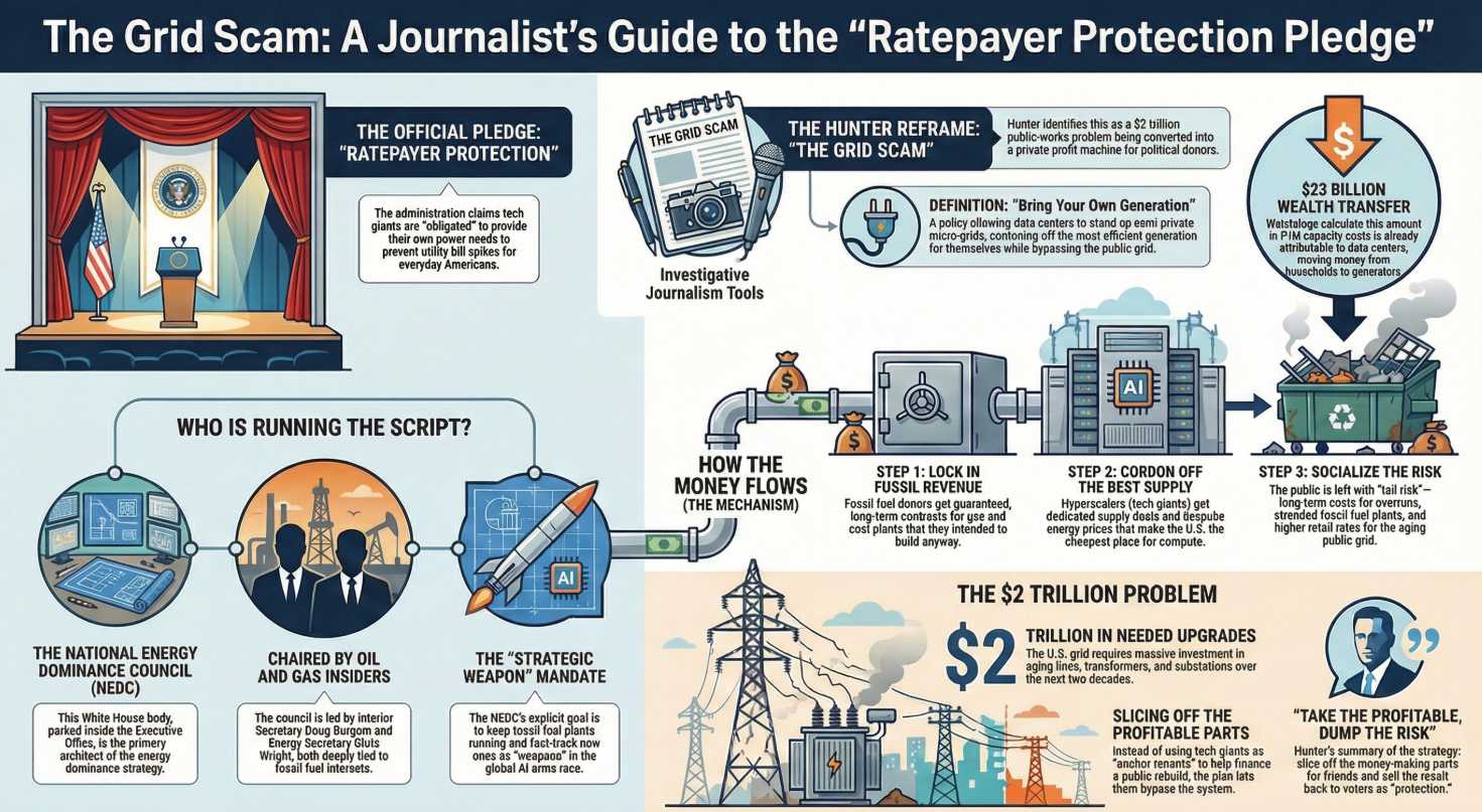 The theater is President Trump promising that everyday Americans won’t pay higher electricity bills because big tech will “provide for their own power needs“. The mechanism, however, is a non-binding “handshake deal” orchestrated by the National Energy Dominance Council (NEDC)—a body run by fossil fuel executives like Doug Burgum and Chris Wright. By pushing Hyperscalers to “Bring Your Own Generation” (BYOG) behind the meter, the administration is bypassing traditional public utility regulations, allowing tech giants to build private power fiefdoms while explicitly leaving the public grid to rot. They are treating the public grid not as a shared resource to invest in, but as a subsidized backup battery for their AI empires.