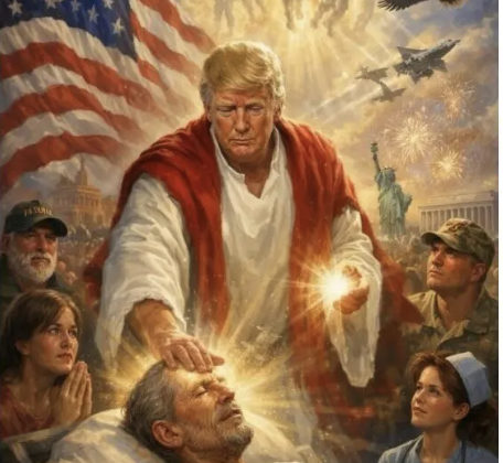 The image showed President Trump in a white and red robe, commonly used in renderings of Jesus Christ and in Scripture prophesying his return. Bright golden light, which is used to depict divine intervention in religious imagery, radiated from Mr. Trump’s hand as he touched the forehead of a sick man. A woman observed the scene with her hands steepled in prayer.