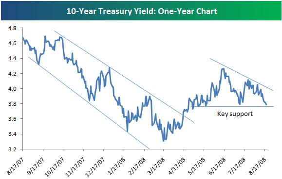 We did not hold our morning levels and oil did not break below $110. GOOG had another terrible day but AAPL held it together. HPQ had nice earnings and raised guidance, that might be good for something in the morning but the real test now comes on the financials as GS dropped the big one, usually marking the end of a round of hyena attacks. Meanwhile, all this nonsense about financial troubles is sending money flying into treasuries and the 10-year note is back at a key support level of 3.8 (Bespoke chart).
