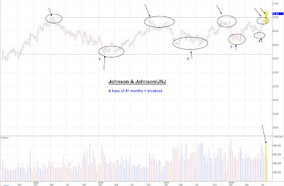But it is the chart above that helped me, over the past 3 1/2 years, to perceive this chart — as it built its setup and pattern — to be "profoundly bullish." The high level consolidation pattern betrays itself to be part of a 15 year ascending triangle. The ideal breakout from this pattern would occur approximately 42-47 months from the inception of the base, or 67-75% of the way to the apex of its pattern (June 2010), which calculates as now to March 2009; in fact, Johnson & Johnson/JNJ broke out 2 weeks ago. Remember from the first chart that JNJ made higher bottoms throughout its high level consolidation, showing, albeit subtly, that supply was slowly giving way to increasing demand for the shares. The ideal entry point in Johnson & Johnson/JNJ would be a test back to the 67-69 area, a short term price oscillation for a stock in a long term up trend and that has just broken above its major intermediate term base, but my upside objective counts as ~$125. Assuming my chart reading ability and follow-on expectation to be correct results in a downside risk of ~$5, and a possible and potential upside reward of ~$55, an 11:1 reward:risk ratio. And in a company that is about as blue as blue chips can be.
