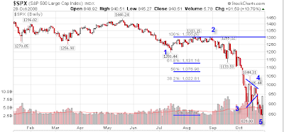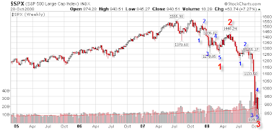 The crash wave (wave 3) may be complete. Technically today’s massive rally could still be a part of wave 4 of 3 up, but judging from the action in other indices, the most likely count is that wave 3 is complete.