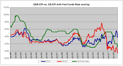 The Situation reversed in Autumn of 2006 with the Fed Funds rate at 5.25% and CS-CPI under 1%. This helped pop the bubble (a good thing) but it would have been better to not have the bubble in the first place.