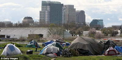 Rich and poor: The tents and other makeshift homes have sprung up in the shadow of Sacramento’s skyscrapers
