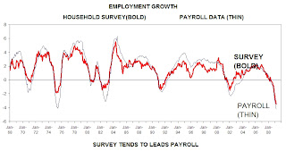 The one encouraging item was a repeat of last month where the household survey is now showing weaker employment losses than the payroll survey. This is a leading indicator for the economy that I have watched for years. Interestingly, a couple of academics just published an NBER working paper where they discovered the cyclical pattern of the household survey leading the payroll survey at economic bottoms.