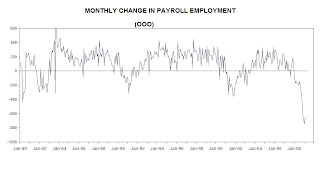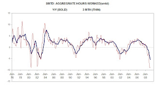 The index of hours worked is now at 93.6 — versus 100.0 at the peak. This is a more severe drop than the 94.2 in the 1981-82 recession and almost as bad as the 92.5 bottom in the 1974 recession.
