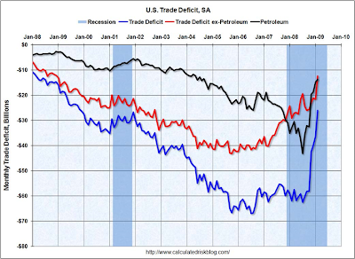 Calculated Risk has an interest chart of the trade deficit and the trade deficit excluding petroleum.