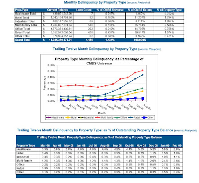The total unpaid balance for all CMBS pools under review by Realpoint was $837.78 billion in February 2009, down from $842.8 billion in January. Both the delinquent unpaid balance and delinquency percentage over the trailing twelve months are shown in the chart above and the one below, clearly trending upward for the timeline.
