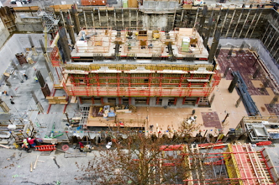 At the job site Friday, the concrete, mechanical and iron workers left the site about 3 p.m. with the building 15 percent finished. It remains just a parking garage, frozen for now about three floors below ground.