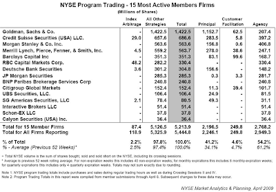 A very interesting data point, also provided by the NYSE, implicates none other than administration darling Goldman Sachs in yet another potentially troubling development. The chart below demonstrates the program trading broken down by the top 15 most active NYSE member firms. I bring your attention to the total, principal, customer facilitation and agency columns. [click on charts for sharper view]
