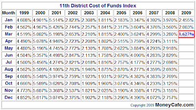 The History of COFI shows the March 2009 index value at 1.627, a record low. A year ago index value was 3.280. Last month it was 2.003.